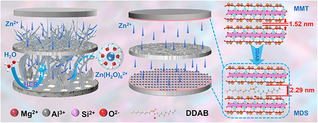在上述研究工作基礎(chǔ)上,為進(jìn)一步拓寬Zn2+的傳輸通道、實(shí)現(xiàn)“親鋅疏水”和Zn(002)晶面沉積的有效調(diào)控,研究團(tuán)隊(duì)通過雙十二烷基二甲基溴化銨(DDAB)插層MMT成功制備出MDS改性黏土礦物材料,并將其均勻涂覆于鋅箔表面構(gòu)筑出MDS@Zn復(fù)合陽極。研究結(jié)果表明,MDS涂層不僅能夠有序引導(dǎo)Zn2+傳輸、促進(jìn)(002)晶面擇優(yōu)沉積,且能有效阻隔電解液與鋅負(fù)極之間的直接接觸,繼而顯著抑制鋅枝晶生長、析氫反應(yīng)及腐蝕副反應(yīng)。DFT計(jì)算證明,MDS對Zn2+、H2O和SO42–表現(xiàn)出更強(qiáng)的吸附能,進(jìn)一步驗(yàn)證了其優(yōu)異的電化學(xué)界面調(diào)控能力。電化學(xué)研究表明,MDS@Zn對稱電池在2mA cm–2和1mAh cm–2條件下可實(shí)現(xiàn)超過3620小時的穩(wěn)定循環(huán),在5mA cm–2的高電流密度下仍能連續(xù)運(yùn)行3800小時。MDS@Zn||Cu半電池在1mA cm–2和1mAh cm–2條件下循環(huán)3600小時后,平均庫侖效率高達(dá)99.5%。此外,基于MDS@Zn負(fù)極與VO2正極構(gòu)建的全電池在2.5A g–1下經(jīng)歷1300次循環(huán)后,容量保持率仍達(dá)95.5%,展現(xiàn)出優(yōu)異的循環(huán)穩(wěn)定性和應(yīng)用前景。